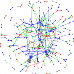 Network of users communicating on Wikipedia article talk pages. Blue: two Democrats; Red: two Republicans; Green: inter-party dialogue.