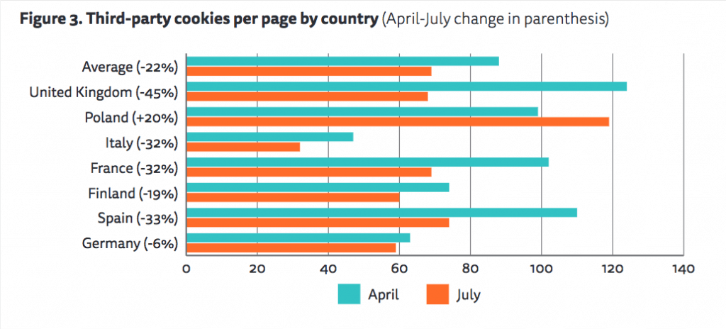 The number of third-party cookies per page dropped by 22% across all news sites. German news sites, which had the second-lowest number of cookies in April, exhibit the smallest change with 6% fewer cookies. UK news sites, which had the most cookies per page in April, had 45% fewer by July.